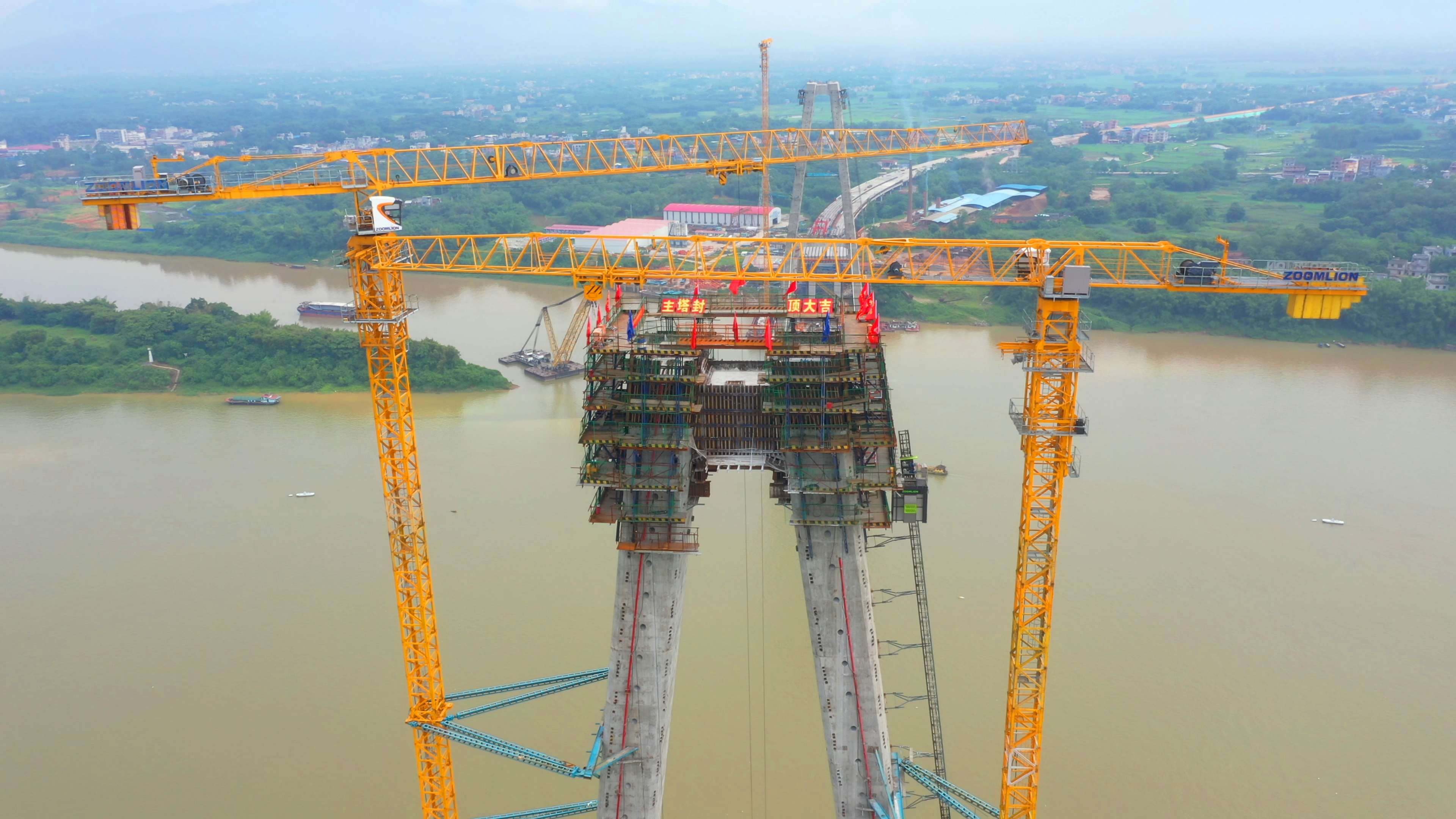 大橋北主塔已于2020年4月26日封頂,本次南主塔順利的封頂標(biāo)志著該橋兩座廣西最大的斜拉橋塔柱正式落成,大橋最大的“鋼-混組合梁”已于5月3日吊裝完畢,目前建設(shè)進(jìn)度已達(dá)75%。